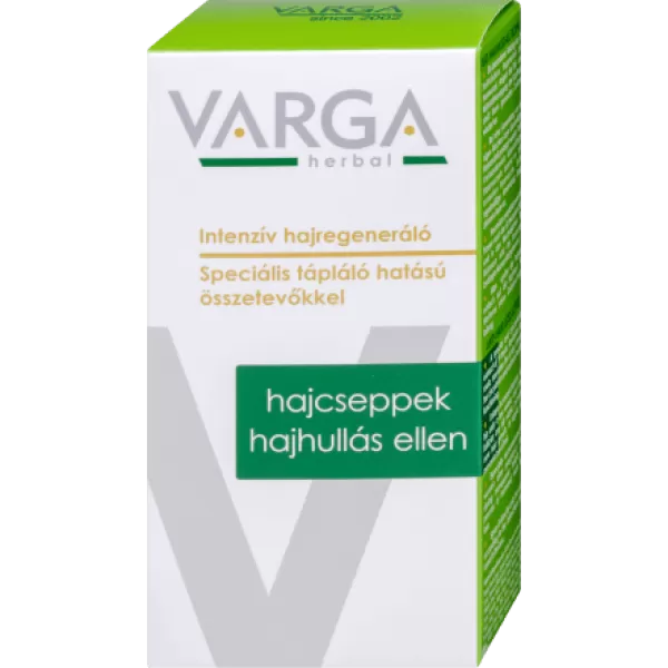 A Varga Hajcseppek 50 ml-es kiszerelése 19 gyógynövény tiszta, koncentrált kivonatát tartalmazza. A termék célja a hajhullás csökkentése és az egészséges hajnövekedés elősegítése.
